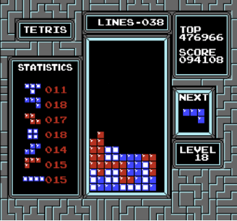 Another piece of advice is that because tetrises score 4 times more than triples, it is more efficient to score tetrises than any other method. Additionally, since classic Tetris is right-handed, it is slightly easier to move pieces to the right than to the left. Therefore, the optimal stacking structure is an empty right-most column, with pieces being stacked in the other 9 columns. It’s also entirely possible to see I pieces for many lines because Classic Tetris basically entirely relies on a random number generator: if the number generator is 0-6 and an I piece is a 6, it is entirely possible to not roll a 6 for 30 pieces. In these cases, it is needed to clear non-Tetris lines. To most efficiently accomplish this without sacrificing the ability to score a tetris if an I piece comes, you should let the 9th column from the left be one square lower than the 1st-8th columns. As a final tip, I advise you to stack as flat and low as possible because it is easier to place pieces on a flat board than a jagged board.